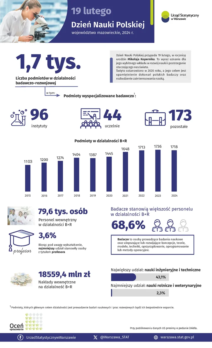 Z okazji Dnia Nauki Polskiej, przypadającego 19 lutego, Urząd Statystyczny w Warszawie przygotował szczegółową grafikę podsumowującą potencjał badawczo-rozwojowy województwa mazowieckiego w 2024 roku. To syntetyczne, ale wymowne zestawienie pokazuje, jak silnym ośrodkiem naukowym jest Mazowsze.